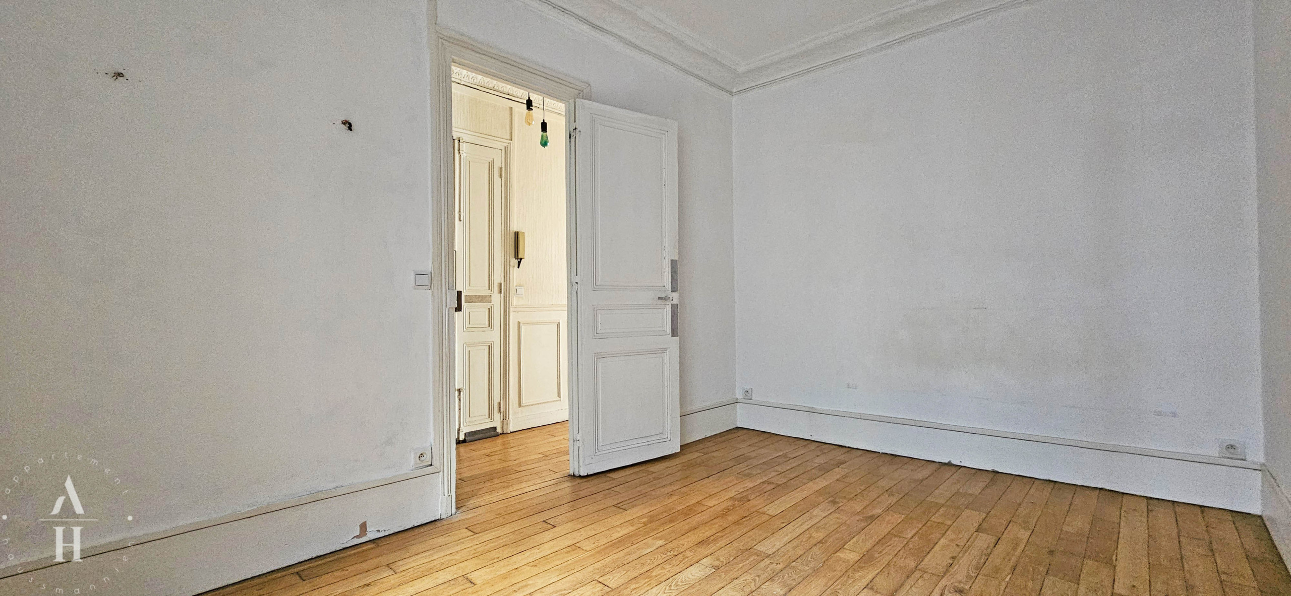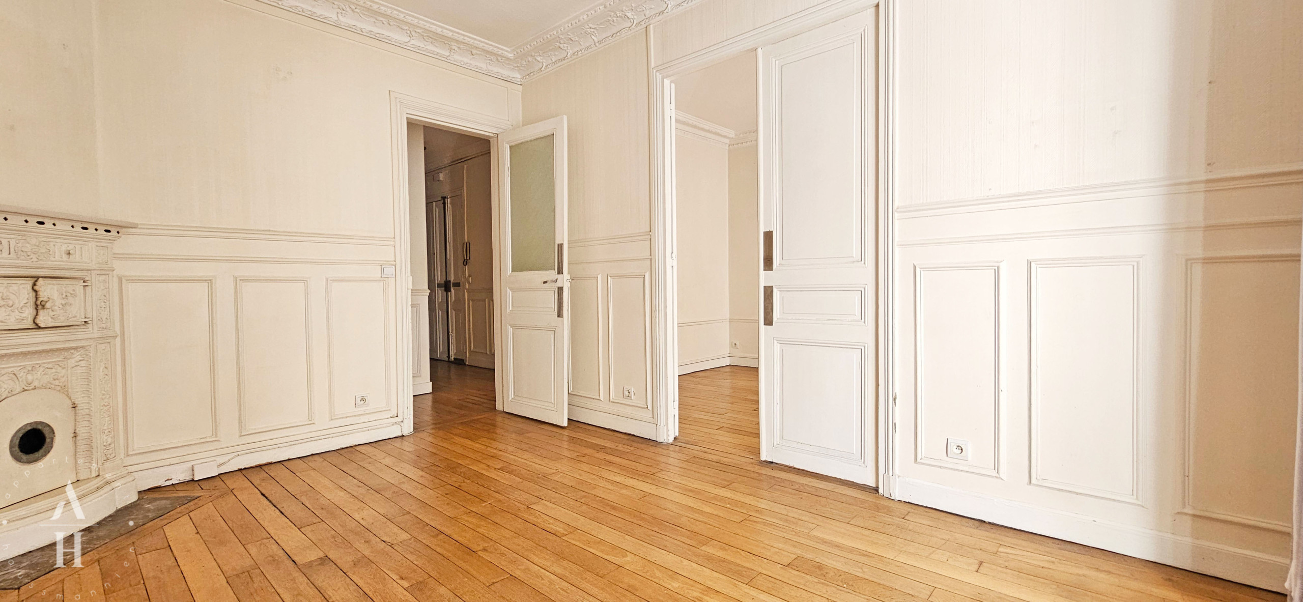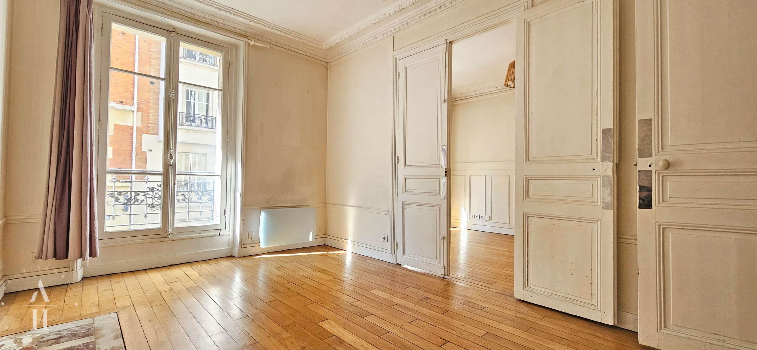 Son plan traversant (rue et cour) orienté sud, offre trois belles pièces principales pouvant être utilisées selon les besoins en « double salon + une chambre » ou « salon simple + deux chambres ». Resté dans son état d’origine, ce bien nécessite une rénovation (sans contrainte technique majeure) qui permettra d’optimiser son plan tout en mettant en valeur ses attributs d’origine, parquet, cheminée, moulures et belle hauteur sous plafond. Le chauffage et l’eau chaude sont individuels et électriques. Les fenêtres sont en simple vitrage d’origine. Une cave est vendue avec cet appartement et une concierge vit sur place.